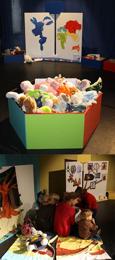 Toi, tu viens d’où, d’où ?Une exposition interactive à partir d’1 an ¾ (!) mêlant jeux, livres au milieu de 180 doudous ! Les 6 double-pages thématiques sont en bois peint sur socle (120×160 cm). L’ensemble est modulable, les double-pages sont à monter séparément ou ensemble pour former un hexagone, en fonction de l’espace disponible.