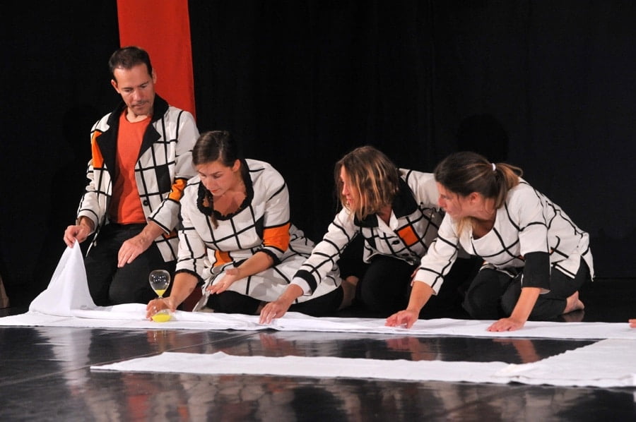 1 – Hélène Poussin (comédienne, lectrice), Virginie Basset (musicienne, violoniste), Cécile Demaison (comédienne, conteuse), Claire Newland (danseuse, éducatrice somatique au développement moteur du nourrisson), Florian Allaire (musicien, comédien).