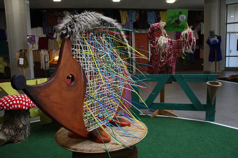 Le jardin : délimité par des barrières de couleur, on y est accueilli par une sculpture-hérisson.