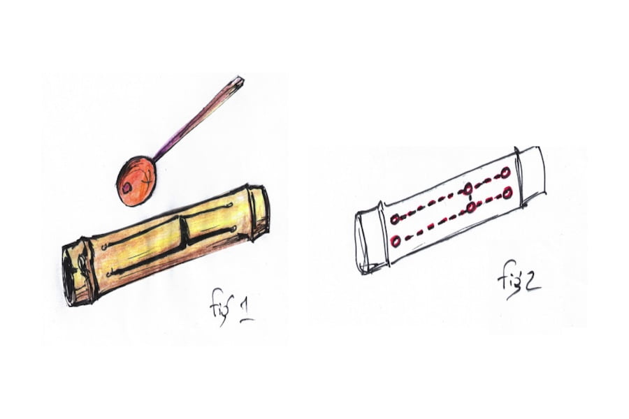 Pour construire ce joli bambou-block à deux tons (fig. 1), il vous suffira d’un simple morceau de bambou, d’un diamètre approximativement compris entre 5 et 10 cm et d’une longueur de quelques dizaines de centimètres. Coupez-le entre deux nœuds, ce qui va le protéger en évitant qu’il ne se fende.