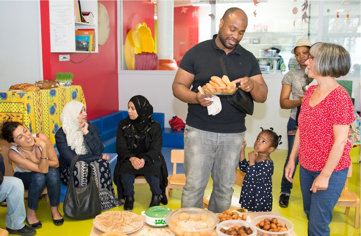 Le pain est un thème qui pouvait réunir des parents aux parcours si disparates. Catherine Mauffroy, coordinatrice petite enfance de la ville de Sarcelles a été très attentive à la démarche. Dans ce projet inscrit dans la durée, les enfants sèment les graines, surveillent la croissance des pousses. À maturation, on moud les graines, on obtient de la farine, on fait du pain. Les véritables compagnons (littéralement « celui avec qui l’on partage le pain ») sont les familles invitées à présenter « leur » pain à la halte garderie lors d’une après-midi festive. La bibliothécaire apporte des livres sur le pain, Caroline Melano, intervenante de la ville, propose un moment de spectacle pour tous avec son castelet et ses histoires. Vient le moment du partage : une trentaine de mamans (et quelques papas) présentent un pain de leur fabrication, en confient la recette et l’usage. C’est d’abord un tourbillon visuel de miches, couronnes, boules et autres flûtes ou lingots. Un tour du monde des cultures alimentaires nous emmène entre autres en Côte d’Ivoire, aux Antilles, en Turquie, aux Comores, au Congo, dans le Sud Tunisien ou encore au Portugal… C’est alors un régal de curiosité quand chaque parent explique la recette et la tradition perpétuée au cœur du Val d’Oise. La grande salle bruisse de rires et de surprises, les enfants attendent tranquillement de pouvoir manger des délices qui rivalisent avec la saveur de gâteaux. Ce temps partagé participe bien de l’invention collective d’un temps de vie familiale et sociale, apaisé.