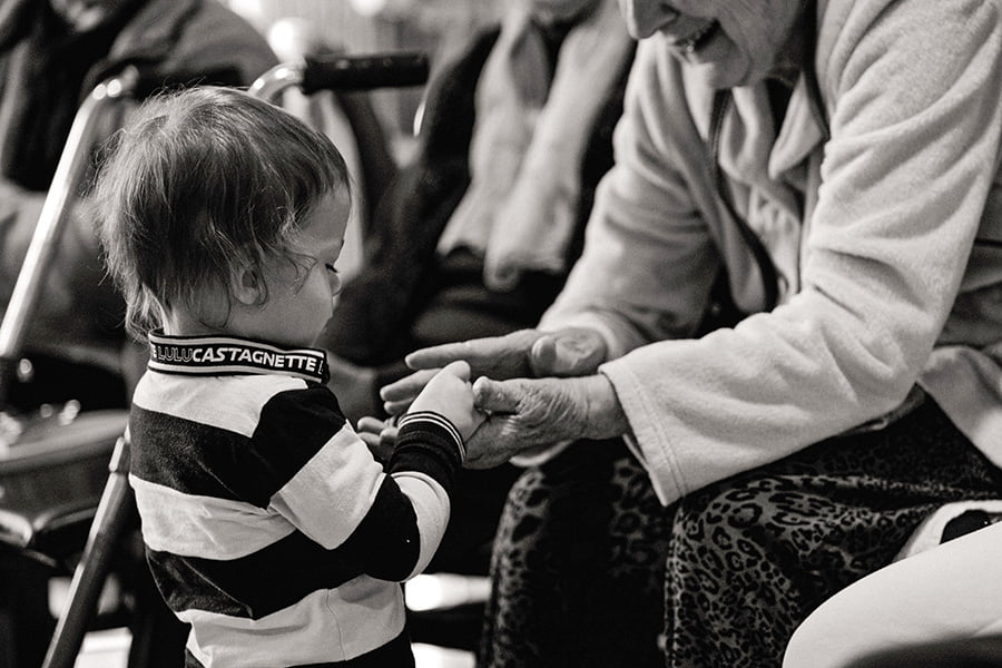 Quand les personnes âgées retrouvent les tout-petits par le prisme des interventions artistiques. La compagnie Du Bazar au Terminus tisse les liens dans le département du Rhône.