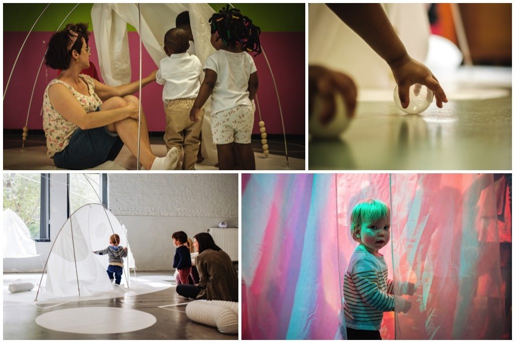 Partant d’une réflexion sur les espaces et les temps d’accueil, les artistes interviennent régulièrement dans les musées. Gaëtane Reginster, Directrice de la compagnie souligne « l’importance de créer des espaces de rencontre, pour diminuer la tension des parents et leur permettre d’être présents à ce qui se passe, sans photo, sans portable, juste dans l’immédiateté de l’instant ! Nous intervenons par exemple au musée des Beaux-Arts de Charleroi depuis 2005, où nous avons imaginé un atelier différent dans chaque salle en lien avec les œuvres exposées. C’est une manière d’interpeller les adultes qui accompagnent les enfants dans leurs découvertes ».