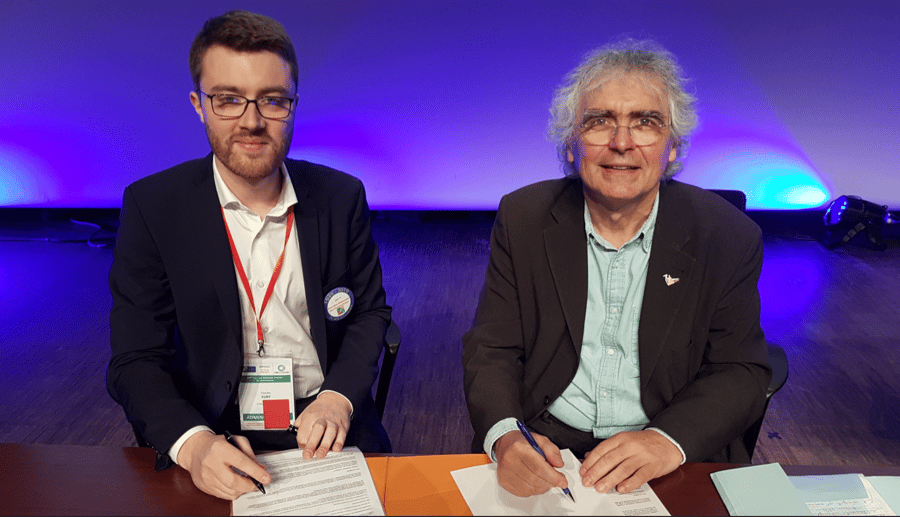 Signature d’une convention de partenariat entre l’Anpde (Association Nationale des Puéricultrices Diplômées et des Étudiants) et Enfance et Musique pour valoriser l’éveil artistique et culturel du très jeune enfant avec Charles Eury et Marc Caillard lors des JNE 2019 (Journées nationales d’études des puéricultrices).